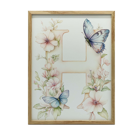 H betűs virágos falikép gyerekszobába - 50x70 cm 🌸 Varázsold el gyermeked szobáját ezzel a gyönyörű, virágos faliképpel! A képen egy nagy H betű látható, melyet finom pasztell virágok és bájos pillangók díszítenek. A sötétbarna fa keret elegáns megje...