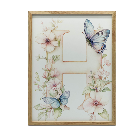 H betűs virágos falikép fa keretben - 70x100 cm Varázsold el gyermeked szobáját ezzel a gyönyörű, kézzel festett virágos faliképpel! A kép egy nagy H betűt ábrázol, melyet gyönyörű virágok és pillangók díszítenek. A sötétbarna fa keret elegáns és idő...