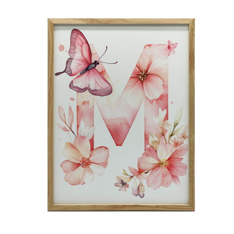 Virágos 'M' betűs falikép - Elegáns dekoráció a modern otthonba 💐 Ez a gyönyörű falikép tökéletes választás, ha egyedi és stílusos dekorációval szeretné feldobni otthonát. Az 'M' betűt finom, pasztell virágok veszik körül, egy pillangóval kiegészítve...