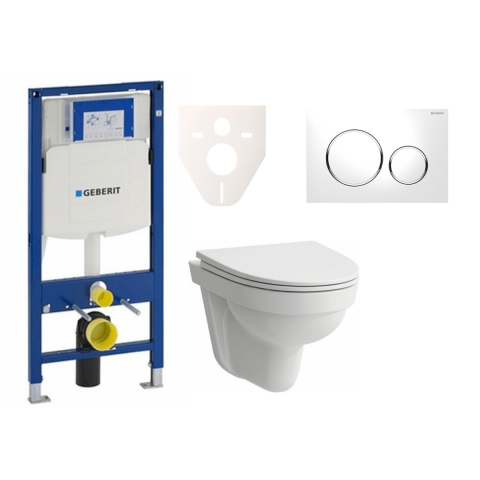 Fali wc szett - a szett tartalmaz modul könnyűszerkezetes falakba / falsík előtti, WC tartállyal Geberit és WC tartály. WC ülőke alapanyaga Duroplast. Nyomógomb alapanyaga műanyag fehér színu.