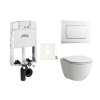 Fali wc szett - a szett tartalmaz modul befalazandó, WC tartállyal Jika és WC tartály. WC ülőke alapanyaga Duroplast. Nyomógomb alapanyaga műanyag fehér színu.