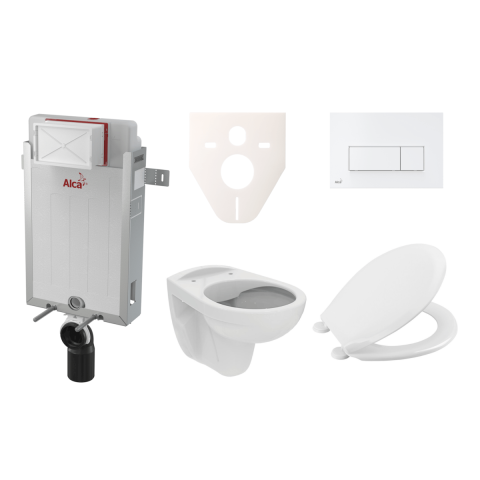 Fali wc szett - a szett tartalmaz modul befalazandó, WC tartállyal Alca és WC tartály. WC ülőke alapanyaga Duroplast. Nyomógomb alapanyaga műanyag fehér színu.