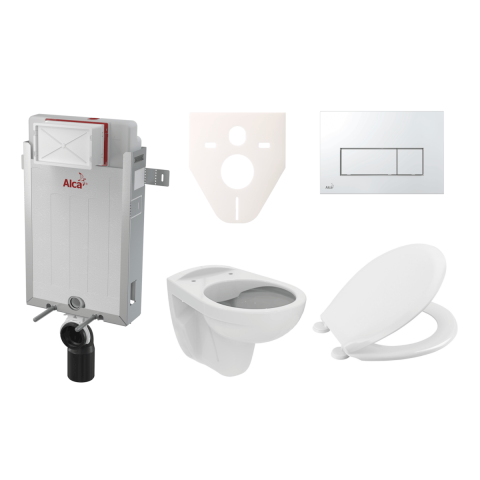 Fali wc szett - a szett tartalmaz modul befalazandó, WC tartállyal Alca és WC tartály. WC ülőke alapanyaga Duroplast. Nyomógomb alapanyaga műanyag krómozott fényes színu.