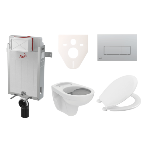 Fali wc szett - a szett tartalmaz modul befalazandó, WC tartállyal Alca és WC tartály. WC ülőke alapanyaga Duroplast. Nyomógomb alapanyaga műanyag matt króm színu.
