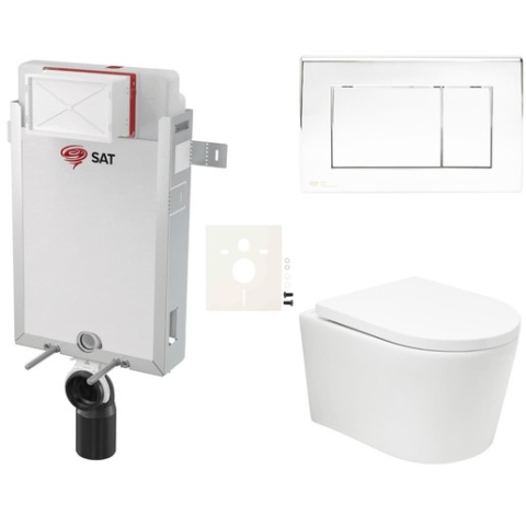 Függő WC-készlet - a készlet tartalmaz egy vortex öblítőt, egy fali modul, egy SAT WC-tartály, egy SAT vezérlőgombot és egy WC-ülőkét. A WC-ülőke duroplast anyagból készült. A vezérlőgomb műanyagból készült, krómfényű.