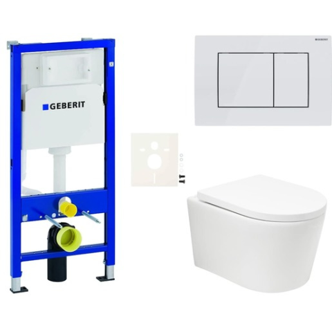 Függő WC-készlet - a készlet tartalmaz egy vortex öblítőt, egy könnyű fal/falazómodul, egy Geberit WC-tartály, egy SAT vezérlőgombot és egy WC-ülőkét. A WC-ülőke duroplast anyagból készült. A vezérlőgomb műanyagból készült és fehér színű.