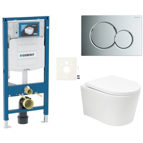Függő WC-készlet - a készlet tartalmaz egy pezsgőöblítőt, egy könnyű fali / válaszfali modult, egy Geberit WC-tartályt, egy SAT vezérlőgombot és egy WC-ülőkét. A WC-ülőke duroplastból készült. A vezérlőgomb műanyagból készült és krómfényű.