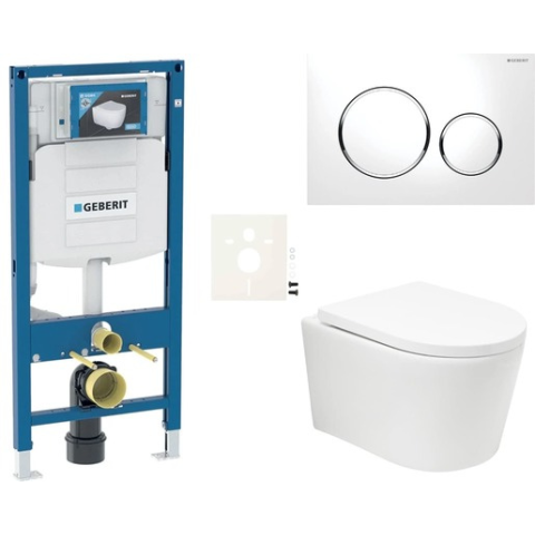 Függő WC-készlet - a készlet tartalmaz egy pezsgőöblítőt, egy könnyű fali / válaszfali modult, egy Geberit WC-tartályt, egy SAT vezérlőgombot és egy WC-ülőkét. A WC-ülőke duroplast anyagból készült. A vezérlőgomb műanyagból készült és fehér színű.