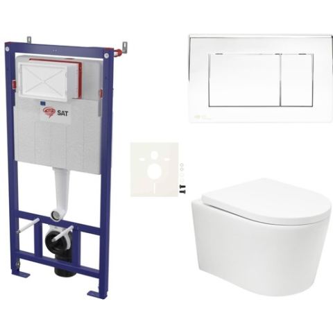 Függő WC-készlet - a készlet tartalmaz egy vortex öblítőt, egy könnyű falra / válaszfalra szerelhető modult, egy SAT WC-tartályt, egy SAT vezérlőgombot és egy WC-ülőkét. A WC-ülőke duroplast anyagból készült. A vezérlőgomb műanyagból készült és krómfényű.