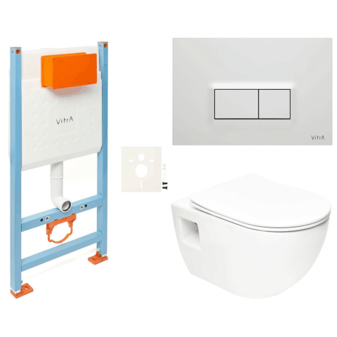 Falra szerelhető WC készlet - a készlet tartalma: V-Fix modul világos falakhoz/elülső falhoz, Vitra WC tartály, Loop Ra vezérlőgomb, WC ülőke. A WC ülőke duroplast anyagból készült. A vezérlőgomb műanyagból készült, és fehér fényes színű.