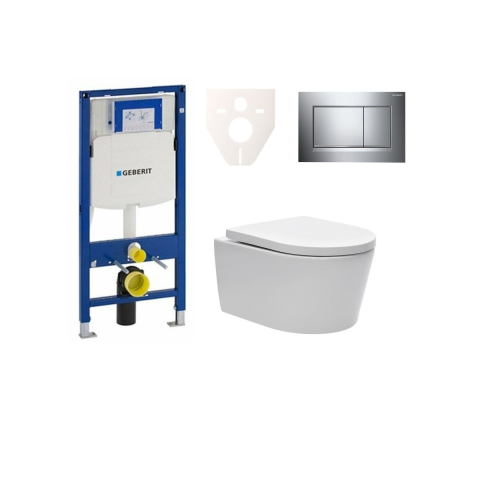 Fali wc szett - a szett tartalmaz modul könnyűszerkezetes falakba / falsík előtti, WC tartállyal Geberit és WC tartály. WC ülőke alapanyaga Duroplast. Nyomógomb alapanyaga műanyag króm színu.
