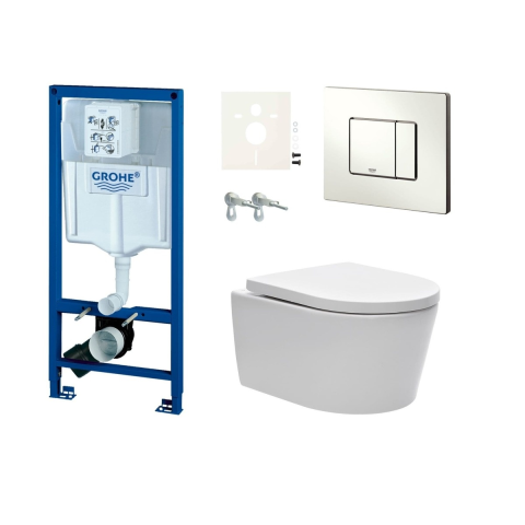 Praktikus WC-szett, amely egy Grohe modulból (G38528000 típus), egy Grohe vezérlőgombból (G38732SH0 típus), egy hangszigetelő betétből és egy SAT WC-ből (SATBRE010RREXP típus), valamint egy tartós duroplastból készült ülőkéből áll. Lassú összecsukási funkcióval (Softclose) és Easy lock funkcióval (az ülés fel- és levétele egyetlen mozdulattal - egyszerű karbantartás) rendelkezik.