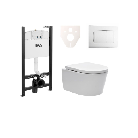 Praktikus WC-készlet, amely egy Jika modulból (H8966120000001 típus), egy Jika vezérlőgombból (H8966170000001 típus), egy hangszigetelő betétből és egy SAT WC-ből (SATBRE010RREXP típus) áll, amely tartós duroplastból készült ülőkével rendelkezik. Softclose funkcióval rendelkezik.
