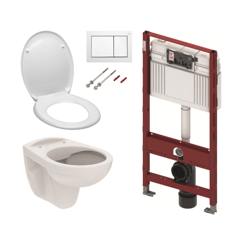 Fali wc szett - a szett tartalmaz modul könnyűszerkezetes falakba / falsík előtti, WC tartállyal TECE és WC tartály. WC ülőke alapanyaga Duroplast. Nyomógomb alapanyaga műanyag fehér színu.