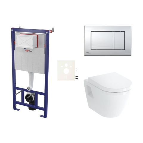 Fali wc szett - a szett tartalmaz modul könnyűszerkezetes falakba / falsík előtti, WC, WC tartállyal SAT és WC tartály. WC ülőke alapanyaga Duroplast. Nyomógomb alapanyaga műanyag krómozott fényes színu.