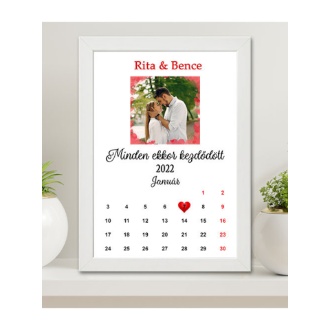 Falikép évfordulóra, minden ekkor kezdődött. Falikép saját fotóval és naptárral, ami szerelmetek kezdetét jelzi. Tökéletes meglepetés akár házassági évfordulóra, de valentin napra is. A képkeret színe, és a szöveg háttere kiválasztható. Falra akasztható,