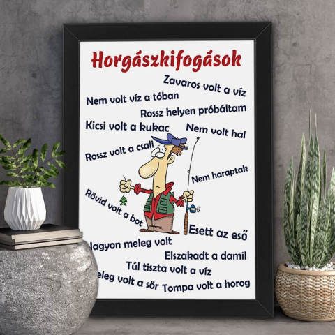 Horgászkifogások – Vicces falikép horgászoknak! Minden horgász tudja, hogy egy sikertelen nap után mindig van egy jó kifogás! Ezzel a humoros 21x30 cm-es keretezett faliképpel most egy helyen találhatók a legjobb horgászkifogások, amiket bármikor elő lehe