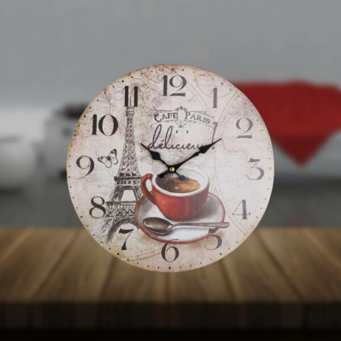 34 cm átmérőjű kör alakú CAFE PARIS falióra dekorral. Az óraszerkezet egy AA elemmel működik (nem tartozék). A termék ideális dekorációja lakásának vagy stílusos konyhájának.