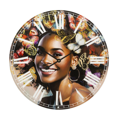 Falikóra elegáns nővel és pillangókkal - 60 cm átmérőjű 🦋 Ez a gyönyörű falikóra egy elegáns nőt ábrázol, színes pillangókkal a hajában. A kép lenyűgöző részletgazdagsággal készült, és garantáltan feldobja otthonát. A klasszikus római számok elegán...