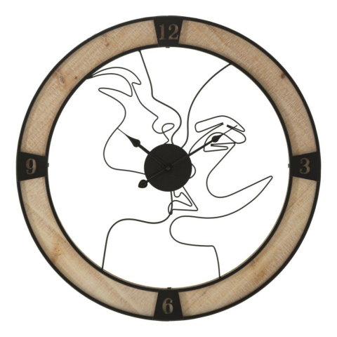 Modern Falióra Pároknak - Fa és Fém Kombináció - 60 cm átmérőjű Ez a stílusos falióra tökéletes választás modern otthonokba. A fa és fém kombinációja elegáns megjelenést kölcsönöz, a két stilizált arccal díszített számlap pedig egyedi hangulatot tere...