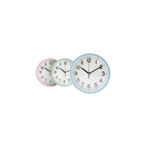 Falióra 22,5 cm átmérővel. Fehér hátlappal, fekete számokkal. Keret színei: pasztell színű.