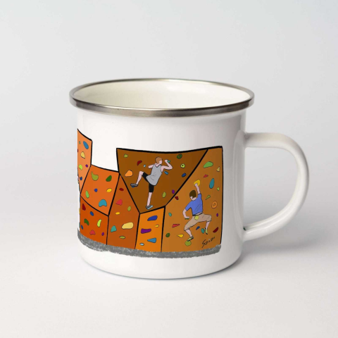Zománcozott fém bögre falmászós mintával, amely felirattal névre szólóvá is tehető.A fém anyag miatt mikrohullámú sütőbe nem tehető be. Mosogatógépben tisztítható.