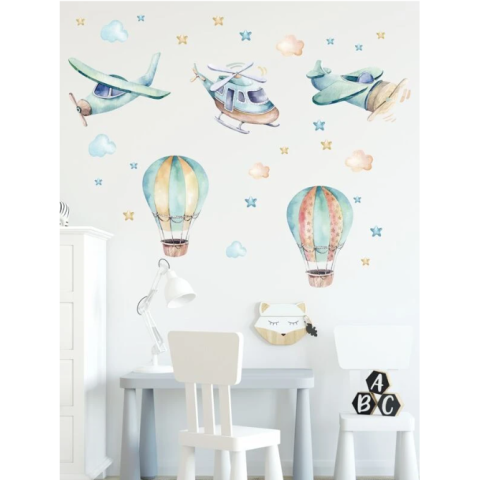 Varázsolja el gyermeke szobáját ezzel a meseszép, öntapadós falmatricával! A matricák vidám légi járműveket, színes felhőket, csillagokat ábrázolnak, melyek egyedi hangulatot teremtenek a kisgyermekek szobájában.