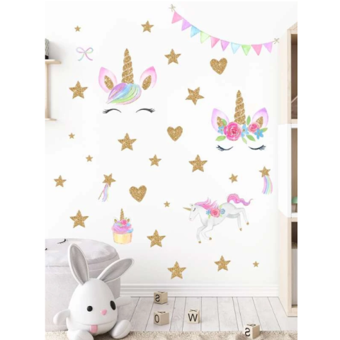 Falmatrica gyerekszobába - Unikornisok, arany csillagok tapéta, díszléc és más dekoráció 1 kép