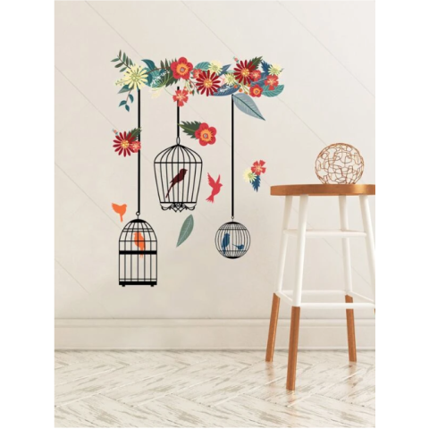 Díszítse otthonád ezzel a színes, madarakat, virágokat, kalitkákat ábrázoló falmatricával, mely könnyen felragasztható és eltávolítható.