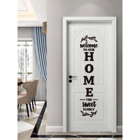 Ez a falmatrica tökéletes választás, ha szeretnéd feldobni otthonod hangulatát egy kedves, üdvözlő üzenettel. A matricán a "Welcome to our home - The sweet family" felirat látható, ami melegséget és otthonosságot sugároz.