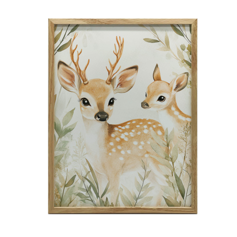 Bűbájos szarvasos falikép: Vidám hangulat a nappaliba 🦌 Ez a gyönyörű falikép két aranyos szarvast ábrázol egy varázslatos erdőben. A képet Marcin Zbijowski neves lengyel művész tervezte, és kiváló minőségű, matt felületű 230 g/m²-es papírra nyomtat...