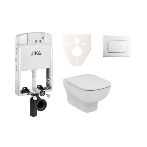 Fali WC készlet - a készlet tartalma: WC öblítőkör nélkül, falra szerelhető modul, Jika WC tartály és WC ülőke. A WC ülőke duroplast anyagból készült. A vezérlőgomb műanyagból készült és fényes fehér színű.