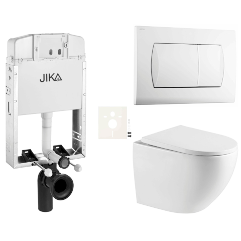 Függő WC-készlet - a készlet tartalmazza: WC vortex öblítéssel, fali modul, JIKA WC-kosár és WC-ülőke. A WC-ülőke duroplastból készült. A kezelőgomb műanyagból készült és fehér színű.