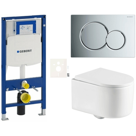 Függő WC-készlet - a készlet a következőket tartalmazza: WC vortex öblítéssel, Duofix modul világos falakhoz / válaszfalhoz, Geberit WC-tartály, Sigma vezérlőgomb, WC-ülőke. A WC-ülőke duroplastból készült. A vezérlőgomb műanyagból készült, krómfényű.