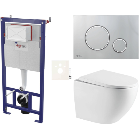 Fali WC-készlet - a készlet a következőket tartalmazza: WC öblítőkör nélküli WC, könnyű falmodul / válaszfal, SAT WC-tartály, SAT vezérlőgomb és WC-ülőke. A WC-ülőke duroplastból készült. A vezérlőgomb műanyagból készült és krómfényű.