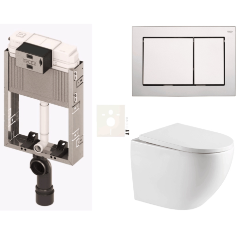 Függő WC-készlet - a készlet a következőket tartalmazza: WC vortex öblítéssel, falra szerelhető modul, WC-tartály TECE, vezérlőgomb TECE talp és WC-ülőke. A WC-ülőke duroplastból készült. A vezérlőgomb műanyagból készült, matt króm színben.