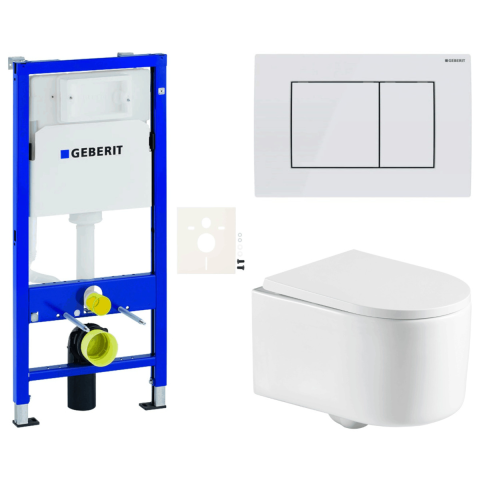 Falra szerelhető WC-készlet - a készlet a következőket tartalmazza: WC öblítőkör nélkül, Duofix modul világos falakhoz / válaszfalhoz, Geberit WC-tartály, Delta vezérlőgomb, WC-ülőke. A WC-ülőke duroplastból készült. A vezérlőgomb műanyagból készült és fehér színű.