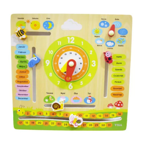 Fa oktatónaptár magyar nyelven, hagyományos zöld alapszínvilággal. Tanuld meg játszva az időt! Egy falra szerelhető minőségi, fa oktatóeszköz, amivel a napokat, hónapokat, évszakokat, időjárást és az órát is beállíthatjátok