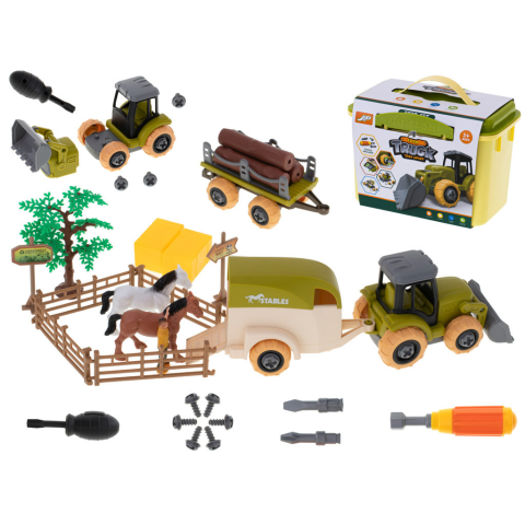 Fantasztikus parasztház sok kiegészítővel. Minden jármű levehető a mellékelt játékcsavarhúzóval. A készlet befolyásolja a motoros fejlődést és fejleszti a gyermek képzeletét. A csavarhúzó hossza: 9 cm. A traktor méretei: 14x8x9cm