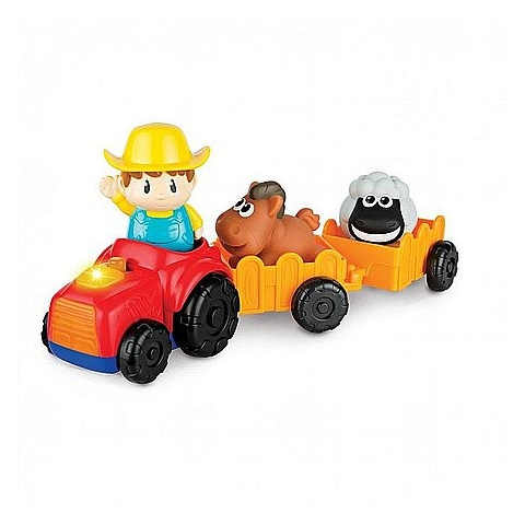 Farm traktor bébijáték Tologasd az állatos traktort, ami fényeket, hangokat is ad ki magából! A Farm traktor bébijáték egy hosszú, műanyagból készült munkagép, két utánfutóval, amiket hozzá lehet csatlakoztatni Az utánfutókon egy bárányt és egy pacit
