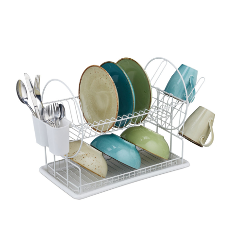 2 szintes edényszárító fehér Ez az edénytartó 2 szinten tárolja a nedves tányérokat és tálakat, és lehetővé teszi, hogy levegőn megszáradjanak. Evőeszközeit és csészéit kényelmesen tárolhatja a kijelölt helyen. A műanyag alap összegyűjti a vizet, így mega