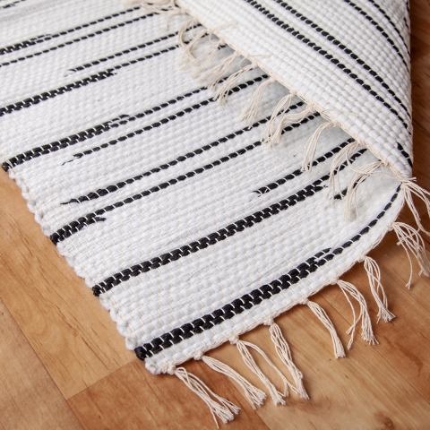 Fehér-fekete kézi készítésű rongyszőnyeg 70x100 cm-es méretben, amely kitűnő választás, a ház bármely helyiségéről is legyen szó.