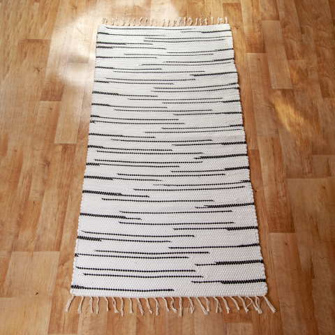 Fehér-fekete kézi készítésű rongyszőnyeg 70x150 cm-es méretben, amely kitűnő választás, a ház bármely helyiségéről is legyen szó.