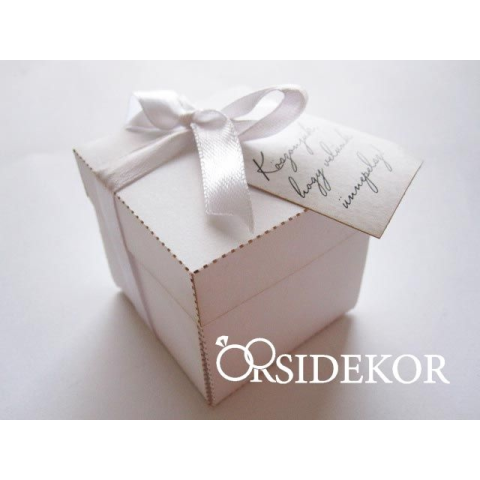 Hagyományos köszönetajándék fehér díszdobozban, fehér szalaggal és ajándékkísérő cédulával díszítve. A dobozkába 3 szem cukrozott mandulát rejtettünk, amelyek az ifjú pár szerencséjét jelképezik, így szimbolikusan a vendégek is osztozhatnak a fiatalokra v