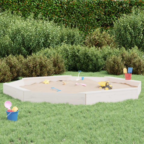 2 kép Fehér nyolcszögű tömör fenyőfa homokozó ülésekkel