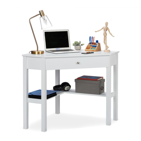 Kis számítógépasztal fiókkal fehér színben Ezzel a sarokasztallal akár egy kis lakásban is tökéletes munkahelyet teremthetsz. A munkafelületen elegendő hely van egy laptop és irodaszerek számára. A fiók és a polc további tárhelyet biztosít könyvek, dokume