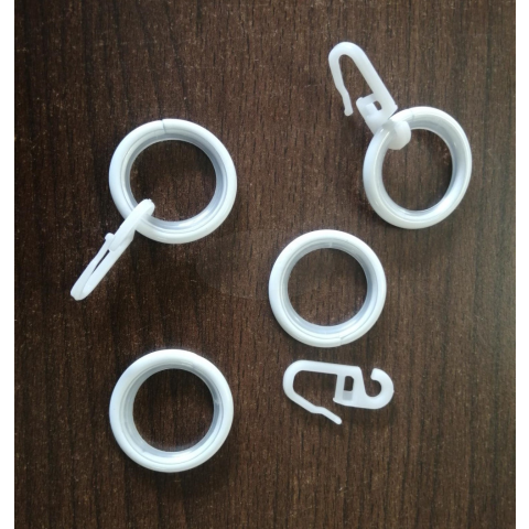 Fehér színű szilikonbetétes fém függönykarika 16 és 19 mm átmérőjű karnis rúdra a hozzá való ráncszedő kampókkal! 10 db/csomag