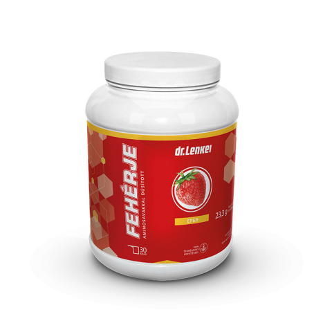 Dr. Lenkei Teljes értékű tejsavó-fehérje aminosavakkal dúsítva Eper ízű; Édesítőszerrel; Különleges élelmiszer, például sportoláshoz, fizikai terheléshez, 30 adag GMO-MENTES. FÜVET LEGELT SZARVASMARHÁBÓL. HOZZÁADOTT CUKROT NEM TARTALMAZ. 100% TERMÉSZETES