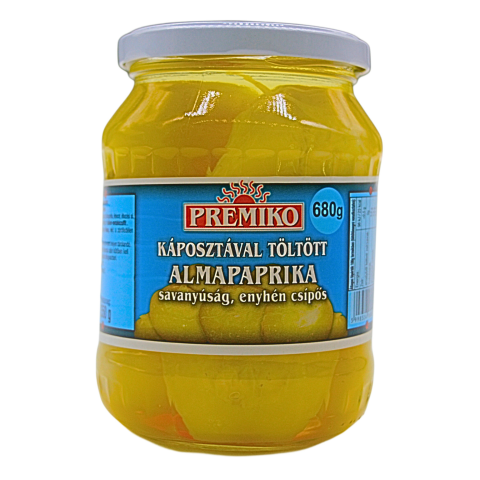 Fehérkáposztával töltött almapaprika savanyúság, enyhén csípős Nettó tömeg: 680g Töltőtömeg: 380g Minimum rendelhető mennyiség: 1db (A kép csak illusztráció.)