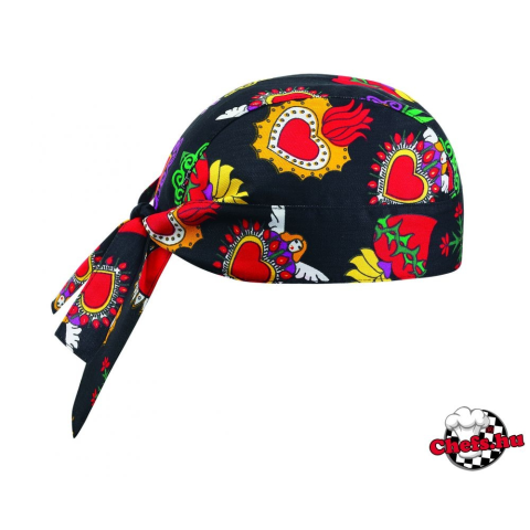 Uniszex fejkendő, bandana kendő, mérete hátul kötővel állítható. Anyag: 100% pamut, 180 g/m2 Szín: fekete, szívmintákkal A feltüntetett árak bruttó árak, amik már tartalmazzák az ÁFA értékét!